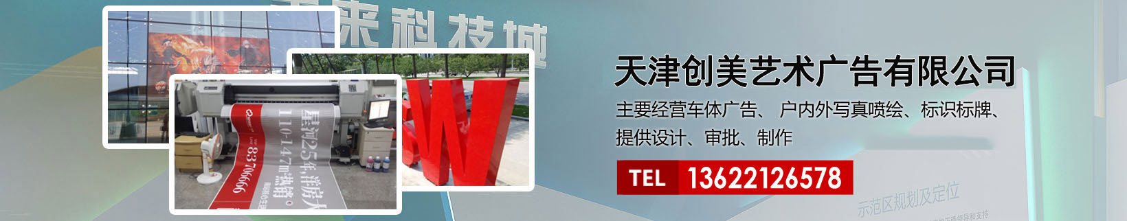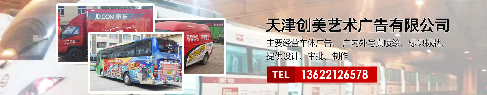 天津創美藝術廣告有限公司主要經營車體廣告、 戶內外寫真噴繪、標識標牌、提供設計、審批、制作、發(fā)布的服務。
